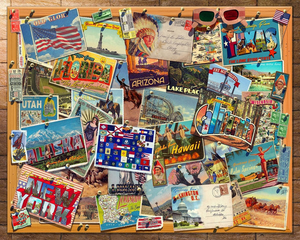 A collage of postcards from the different states is both vibrantly colorful & nostalgic.