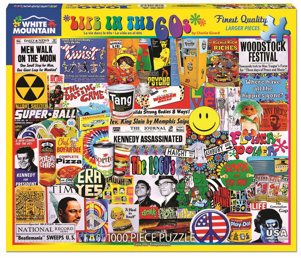 It was the best of times, it was the worst of times. We did the Twist while man first walked on the moon and the movie Psycho changed our bathing habits. We played with GI Joe, Play-Doh and Super-Ball and ate Wonder Bread, Chef Boy-ar-dee pizza, and Burger King Whoppers. We were introduced to Lenny Bruce and horrified by the assassinations of President Kennedy in 1963, Malcolm X in 1965, Martin Luther King in 1968, and Bobby Kennedy two months later. Beatlemania swept the nation and we cheered as Muhammed Ali won the heavyweight title in 1964. Hippies promoted Peace & Love with Flower Power sockin' in to us at Woodstock in 1969. This vibrant 1,000 piece collage was created by Charlie Girard