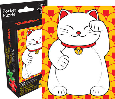 A white cat happy, lucky cat. This 100 piece puzzle is portable.