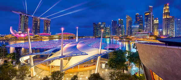 Marina Bay started its construction in 1969 on reclaimed land, and quickly developed into a cutting-edge city. The Marina Bay Sands, at the time of its construction the most expensive resort of its kind, can be seen shooting rays of light towards the city.