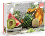 Melons From the Vine 1000 Piece Puzzle features a light and colorful Mediterranean still life of summer melons by Bella Karragiannidis.