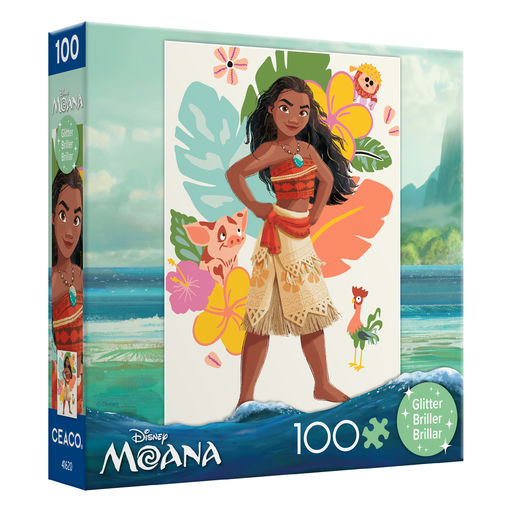 This 100-piece Glitter Disney puzzle features a dynamic illustration of Moana, along with her pals Heihei and Pua, poised for adventure. There are leaves behind her in pastel colors. The puzzle has a sparkly glitter finish. A bonus poster is included. Count on Ceaco for the most Creative, Exciting, and Colorful puzzles since 1987.