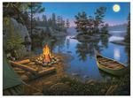 A roaring campfire is positioned near the beautiful moonlit bay in this lovely 1,000-piece jigsaw puzzle titled, “Moonlight Bay” based on the artwork of famed painter Kim Norlien. The campsite is completed with a log bench to soak up the warmth of the fire before retreating to the tent. The camper’s canoe rests along the rocky shoreline.