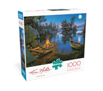A roaring campfire is positioned near the beautiful moonlit bay in this lovely 1,000-piece jigsaw puzzle titled, “Moonlight Bay” based on the artwork of famed painter Kim Norlien. The campsite...