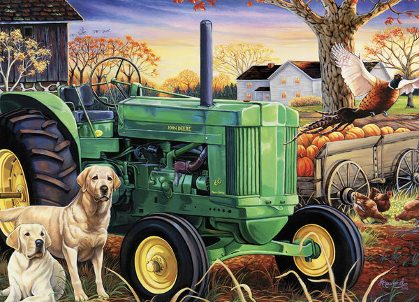 A very colorful, vibrant image of a classic John Deere tractor surrounded by farm animals and a wagon of pumpkins set to a backdrop of the barn, farmhouse and sun...