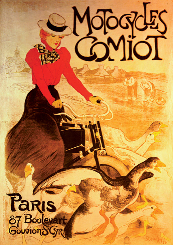 Motorcycles Comiot is a vintage poster created by Theophile Steinlen in 1899 as an advertisement. Text on the vintage poster: "Motocycles Comiot, Paris, 87 Boulevart, Gouvion St Cyr"