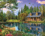 Wood has been split for the cookstove and smoke drifts out the chimney. All is ready for the fish dinner that will no doubt soon be caught by the fisherman who has disturbed a flock of geese at his waterfront retreat. Artist Dominic Davison.