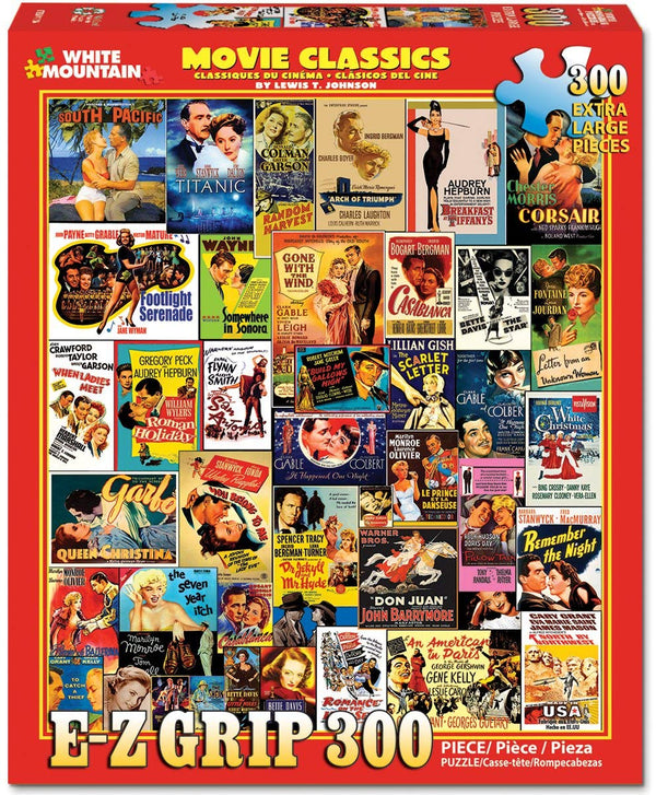 Like watching Turner Classic Movies on television, relax and return to the glory days of cinema with this collage by Lewis T. Johnson. Beginning with Ezio Pinza in South Pacific, you can "binge" with The Seven Year Itch starring Marilyn Monroe, Breakfast at Tiffany's with Audrey Hepburn, Gable's Gone With the Wind and Bogart's Casablanca, The Scarlet Letter with Lillian Gish, White Christmas with Bing Crosby, Queen Christina with Greta Garbo, and An American in Paris with Gene Kelly, or how about Dr. Jekyll and Mr. Hyde with the great Spencer Tracy. Many, many more are pictured on this puzzle with 300 extra large easy-grip pieces.