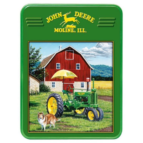 A John Deere tractor and a dog in the countryside