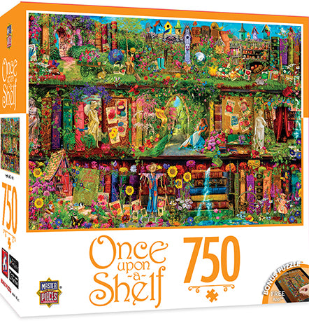 This 750 piece puzzle of Mystical Garden features "shelves" of books being swallowed by a lush garden, filled with flowers, vines, birdhouses, and more!