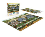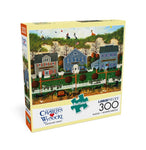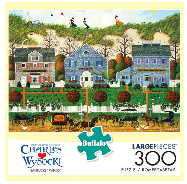 The wonderful little Town of Nantucket lies in the state of Massachusetts. This puzzle represents the earlier days in this New England town, as horses and their buggies wait in the street and colorful kites are flown above. This 300-piece jigsaw puzzle titled Nantucket Winds is by artist Charles Wysocki.