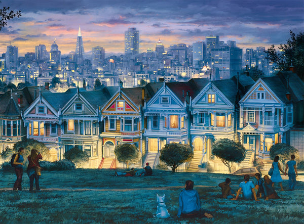 This 1000-piece jigsaw puzzle titled Seven Sisters is from the Night & Day Series by Buffalo Games. This puzzle is a nighttime depiction of the famous “Painted Ladies of San Francisco", otherwise known as “Postcard Row" or the “Seven Sisters". These Victorian Queen Anne-style homes are some of the thousands built in San Francisco during its booming growth at the end of the 19th-century and have become a staple of pop culture. In the background you can se the sun setting over the city skyline. The Night & Day Series captures the energetic ebb and flow from dawn 'til dark of different well-known landmarks around the world.