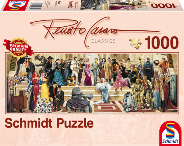 An homage to a century of film-making, featuring people (and dogs and robots) who made their name either in front of or behind the camera. The back of the box features a legend for finding and naming all 51 figures present in the image- can you name them all without looking?