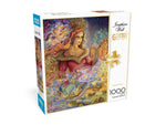 This captivating 1000-piece jigsaw puzzle is titled “Power of Magic” by Josephine Wall and is enhanced with glitter highlights throughout the puzzle! Josephine Wall describes this painting, “The Enchantress weaves her wondrous magic amid floating candlesticks. Swirling spells create a host of surreal scenes. A mermaid riding a blue unicorn, autumn leaves floating down giving elephants a ride, whilst a boy helps a little girl to climb out of a magical picture book. All the joyous fairies and butterflies fly around joining in the fun.”