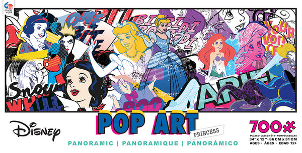 A panoramic puzzle featuring pop art drawings of some of the Disney princess.