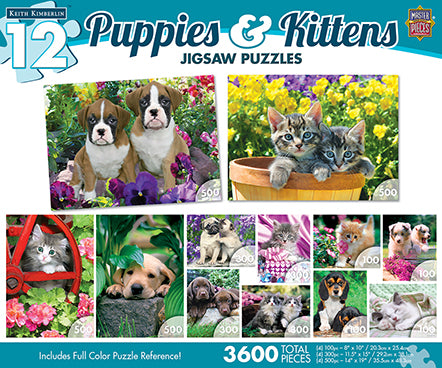 This puzzle pack of Puppies and Kittens includes a fold-out giant panoramic poster of all 12 images. Each puzzle has a custom pattern on the back to make it easy to keep puzzles organized, and the entire pack includes 4 x 100 piece puzzles, 4 x 300 piece puzzles, and 4 x 500 piece puzzles.
