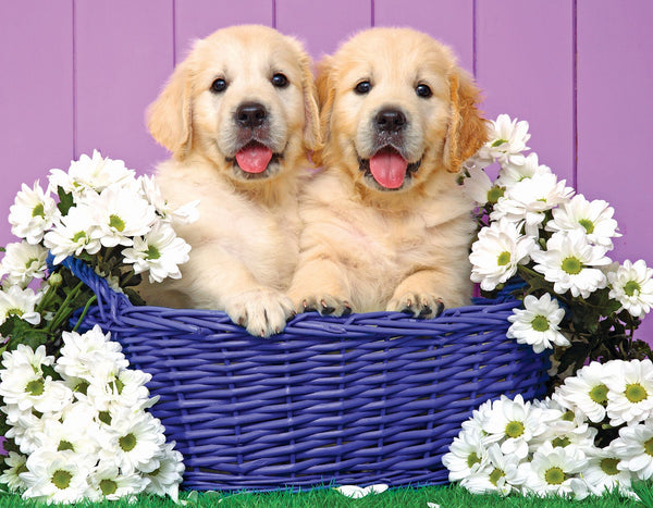 White flowers and golden puppies carried in a deep blue wicker basket.