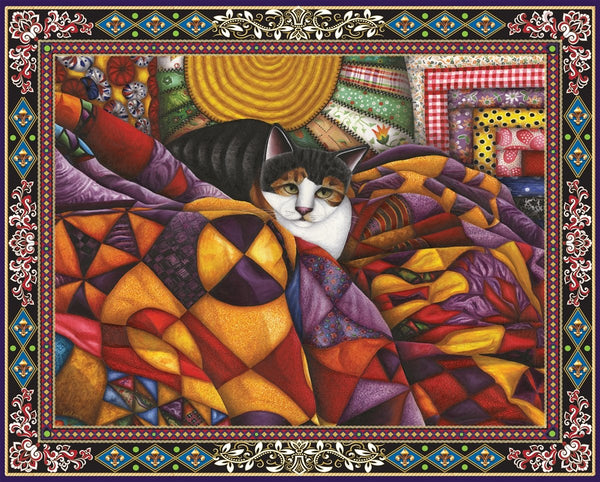 Curl up with "Quilted Cat," the 1000 piece jigsaw puzzle from Springbok. This adorable picture of a cat surrounded by quilts is filled with a plethora of gorgeous colours.