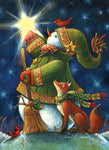 A snowman and his fox companion are awed by the brilliance of a star's light on a cold winter night.