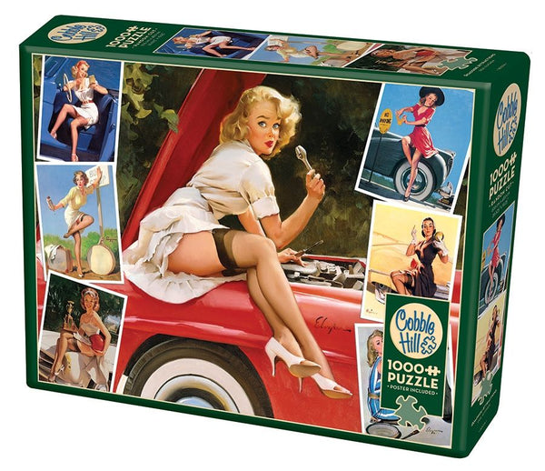 Roadside Attractions features classic cars and pin-up girls; the perfect combination of vintage art.