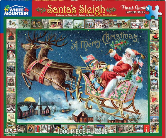 Vintage Christmas cards and nostalgic scenes frame this lively and patriotic view of Santa and his array of gifts. Two sturdy reindeer propel the laden sleigh over a snow-covered hamlet, on their way to the homes of good little children. This 1,000 piece puzzle was designed by Beryl Peters