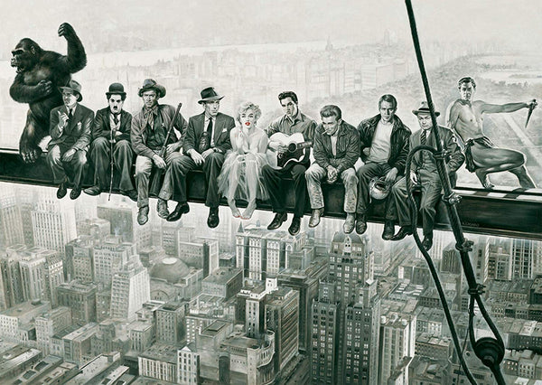 Stars of the 1930s hang out together on a steel beam in the style of the famous "Lunch atop a Skyscraper" photograph.