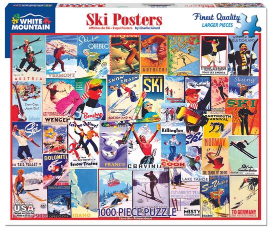 Artist Charlie Girard designed this vintage Ski Posters puzzle featuring ski areas in both America and Europe.