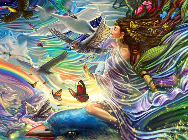 A fairy astride a bluebird rides the auroral winds accompanied by other creatures of the sky, from moth to eagle.