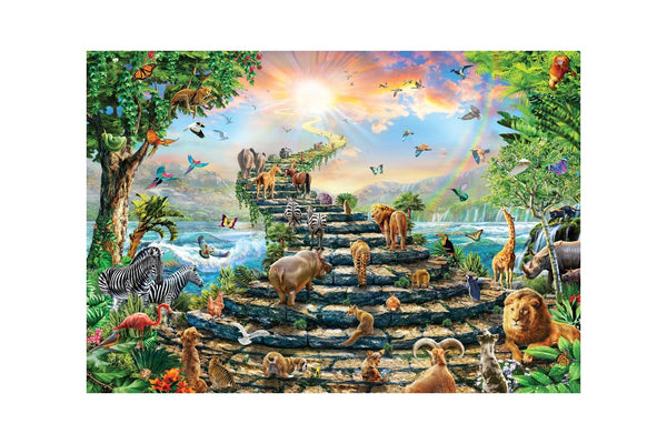 The animals are ascending up stone stairs into the heavens.