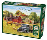 A Summer Afternoon on the Farm at Tally Ho.  The horses, cows and pig graze the fresh green grass  as they wander freely from the barn. An old vintage truck with a bed is the perfect place to lay down, watch the birds fly, and breathe in life in the country. A relaxing 1000 piece country scene by artist Greg Giordano.
