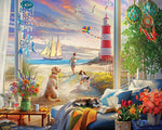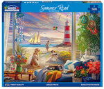Sitting back relaxing with a book in one hand and petting the cat with the other. The sweet sounds of a little boy running on the warm sand flying his kite and the dog happily chasing after him. Artist Angelo Bonita created an image that can invoke memories with this 500 piece jigsaw puzzle.