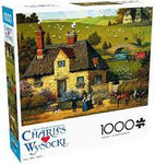 This 1,000-piece jigsaw puzzle, Tall Sea Tale, is by artist Charles Wysocki. A horse and buggy await outside of a stone cottage set on a property with sheep roaming about.