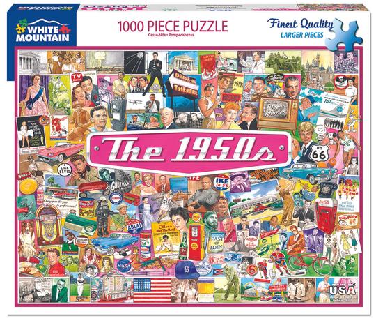 Here’s a brand new compilation of that epic decade. On the world scene we had Rosa Parks, Queen Elizabeth, Castro, Krushchev, Jonas Salk, Stalin, Truman, and McCarthyism, – but we liked Ike and Adlai. In sports we had Willie Mays, the Cleveland Browns, golfers, basketball stars, discus throwers, hockey players and the Boston Red Sox, among others. The Edsel, dial telephones, juke boxes, Coke machines, T-Birds, drive-in restaurants & theaters were all the rage. In movies, television, and music – well, too many to mention! See for yourself in this colorful 1,000 piece puzzle by James Mellett.