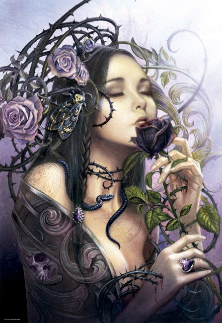 This enchanting image of a dark haired woman smelling a rose wearing a purple gown with thorny rose stems surrounding.