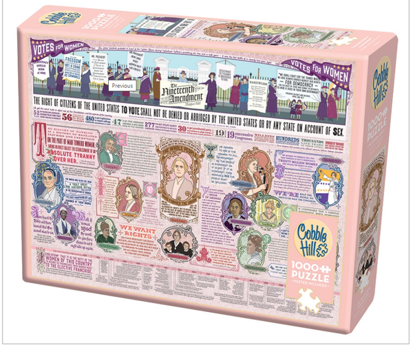 The Nineteenth Amendment puzzle features thirteen amazing suffragists and their thoughts. At the top, the Silent Sentinels protest in front of Woodrow Wilson's White House. And at the bottom, a timeline tracks the progress of women in politics from 1848 to 2020.