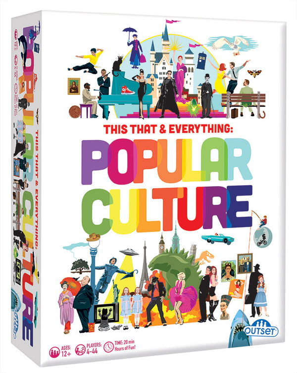 This That & Everything: Popular Culture is about all things related to the entirety of ideas, perspectives, attitudes, images, and other phenomena that is considered mainstream and hyped up. Players race to describe people, places and things related to pop culture for their teammates to guess - in 30 seconds or less! The game includes 100 double-sided cards with six subjects per card, a score pad, pencil, and 30-second sand timer.