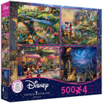 The Thomas Kinkade 4-in-1 puzzles by Ceaco include a Alice in Wonderland puzzle, two Micky & Minnie Mouse puzzles, and a beauty and the beast puzzle - all in one! each puzzle features 500 pieces and measures 18 inches x 14 inches when completed. It is proudly made in the USA.