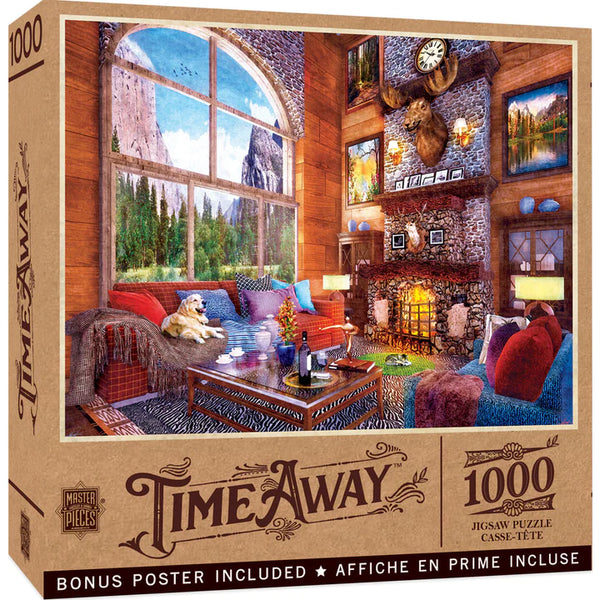 This MasterPieces 19.25" x 26.75" 1000pc Time Away Craft Paper Box Puzzle features beautiful views of the valley and sharp rock walls of the canyon are displayed through two story windows at this luxury cabin. Enjoy a glass of wine in comfort while the woods come to life outside your window.. With its craft paper box, this puzzle has an extra special old-timey feel that makes it the perfect gift for any occasion! To reduce its impact on our environment, the chipboard used in this puzzle is made of recycled material.