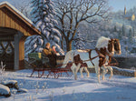 This 1000-piece jigsaw puzzle, Treasured Memories, is based on the artwork of famed painter Kim Norlien, a painter of peace and tranquility. It is a winter wonderland in this holiday puzzle! A couple sit in a vintage horse-drawn carriage being pulled through the snow across a covered bridge. The background is littered with snowy vegetation and a church can bee seen off in the distance lit by the rising sun.