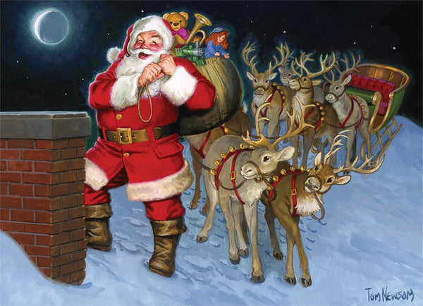 The town is silent on this moonlit night as Santa lands Up On The Rooftop with his reindeer. He's ready to deliver toys to sleeping boys and girls around the world.