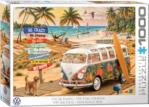 Soak up a little seaside joy. A classic Volkswagen bus in tropical florals, surfers chasing waves, a happy pup on the boardwalk, and a colourful beach sign that reminds us: be crazy, be weird—life’s too short to be anything but happy. With clear zones—turquoise sea, palms, weathered boards and the iconic split-window bus—everyone can claim a favourite section