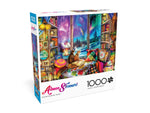 This 1000-piece jigsaw puzzle, Winter Reading Nook, is based on the artwork of Aimee Stewart. In a cozy window nook filled with pillows and blankets, two cats look outside at the cold winter night that has an aurora borealis dancing through the sky. Inside, books and trinkets fill the shelves, creating the perfect place to curl up on the winter’s evening.