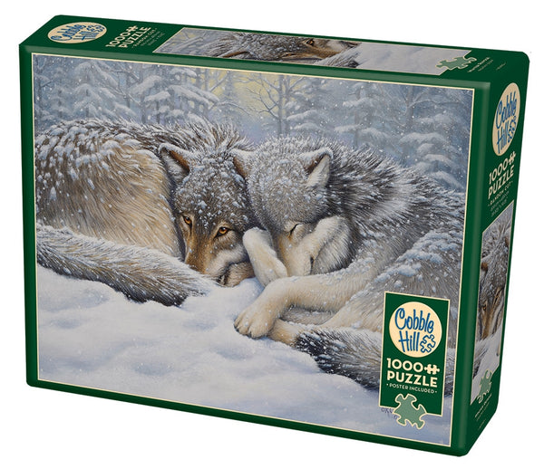 A pair of wolves nuzzle for warmth in the snow. This 1000 piece puzzle is random cut - no two pieces are alike. Cobble Hill puzzles are crafted to museum-quality standards,...