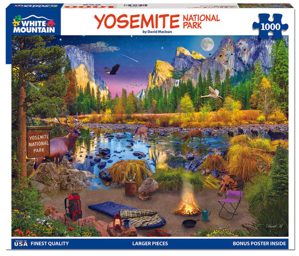 Yosemite. Animals gather at the river at dusk. Deer, elk, bear, and more can be found at the local watering hole drinking or hunting for their next meal. A camp site is set up off to the side with a fire blazing to keep the occupant warm. A squirrel and chipmunk get close while a coyote hides in the brush nearby, curiously watching what the visitor is doing. Artist David Maclean offers a majestical view of one of California’s national parks